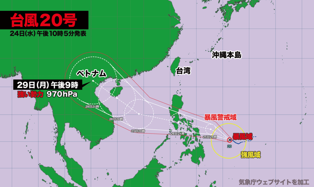 In the Philippines, which has only recently suffered damage from Typhoon No. 18, the risk of further destruction from heavy rain and strong winds is a major concern. Vietnam, where the storm is expected to come ashore, may also face severe impacts.