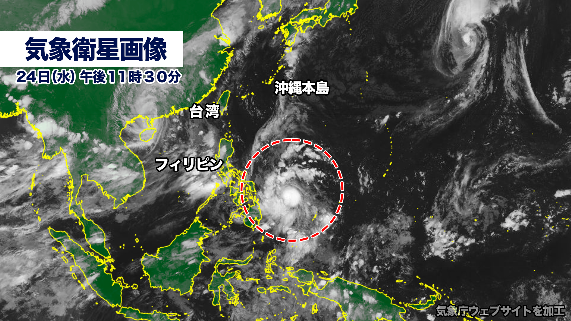 24日水曜日午後9時現在、台風の中心気圧は985ヘクトパスカル、最大瞬間風速は45メートル、風速25メートル以上の暴風域を伴っています。