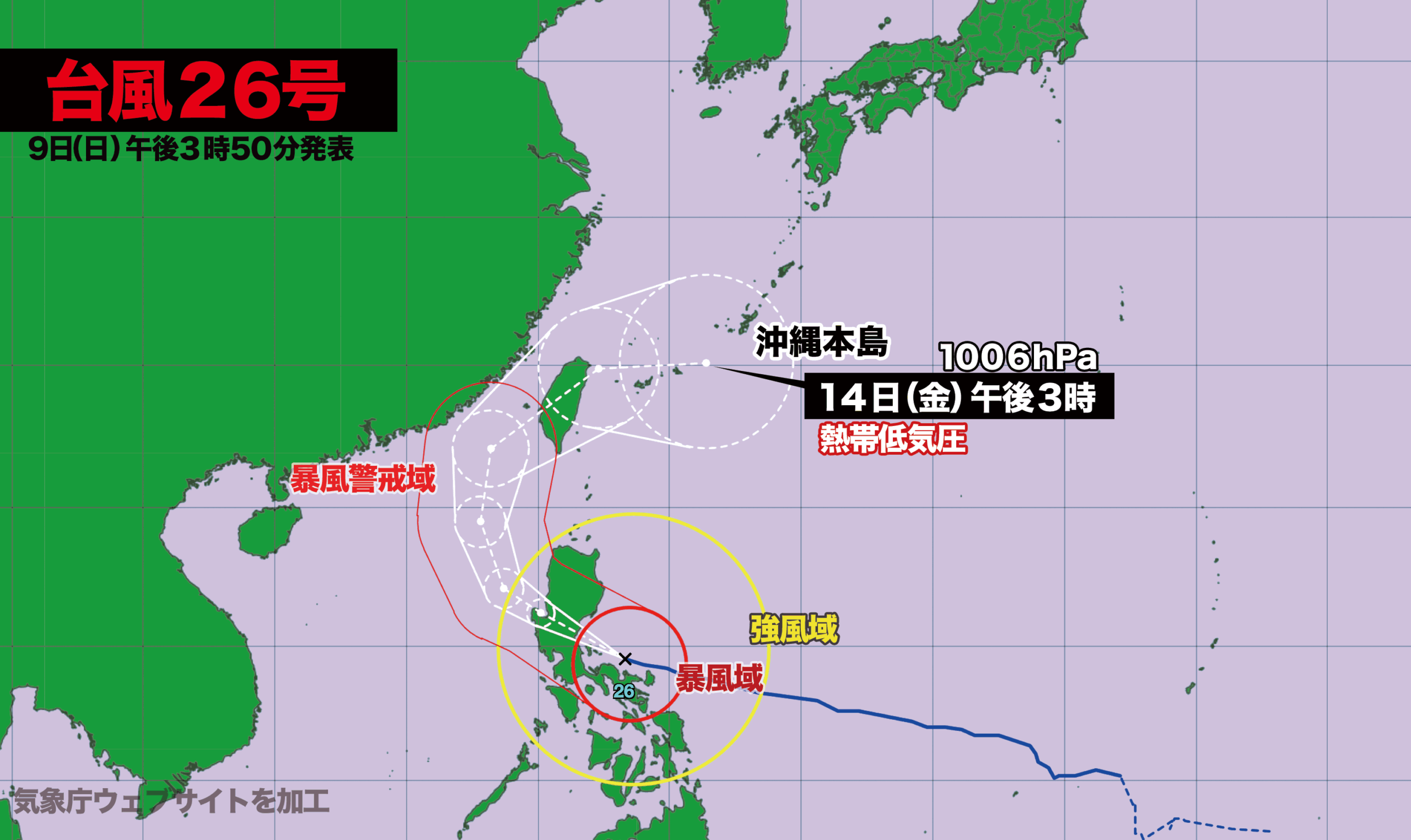 台風はフィリピンを通過後、南シナ海を北上。13日木曜日は台湾を直撃、14日金曜日に沖縄付近で熱帯低気圧に変わる見込みです。