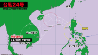 台風24号がフィリピンを直撃中。この後は南シナ海を西寄りに進み、ベトナムに上陸、カンボジアで熱帯低気圧に変わる見込み